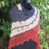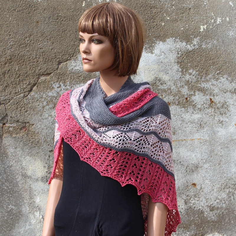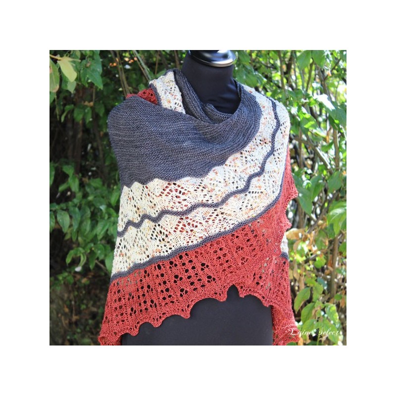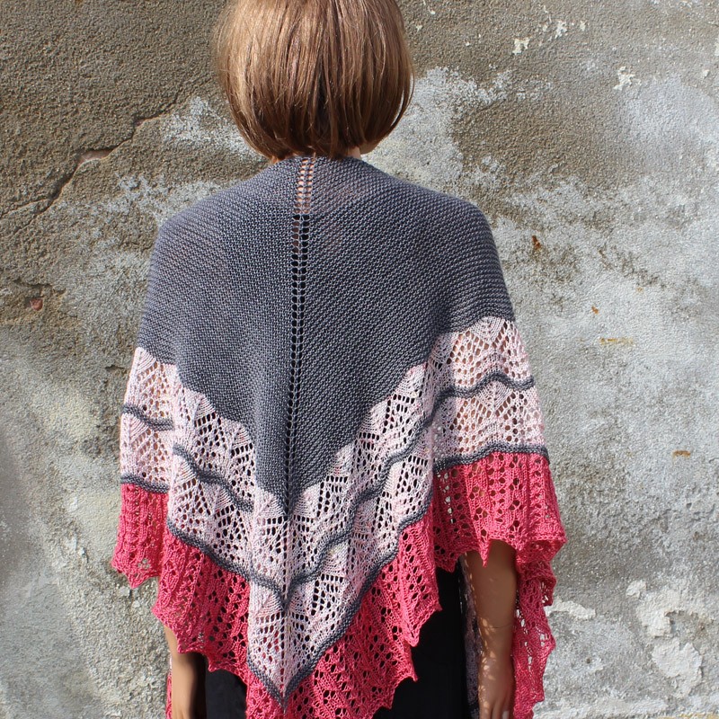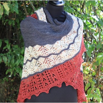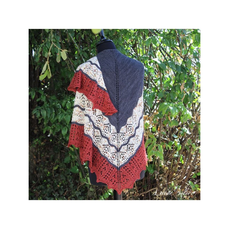 Chihiro est un grand châle triangulaire tricoté de haut en bas, en une seule pièce. Il débute par du point mousse et se poursuit avec une large bordure ajourée empruntant divers motifs de dentelle du Japon. Il est réalisé avec trois couleurs mais est également magnifique monochrome.
