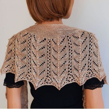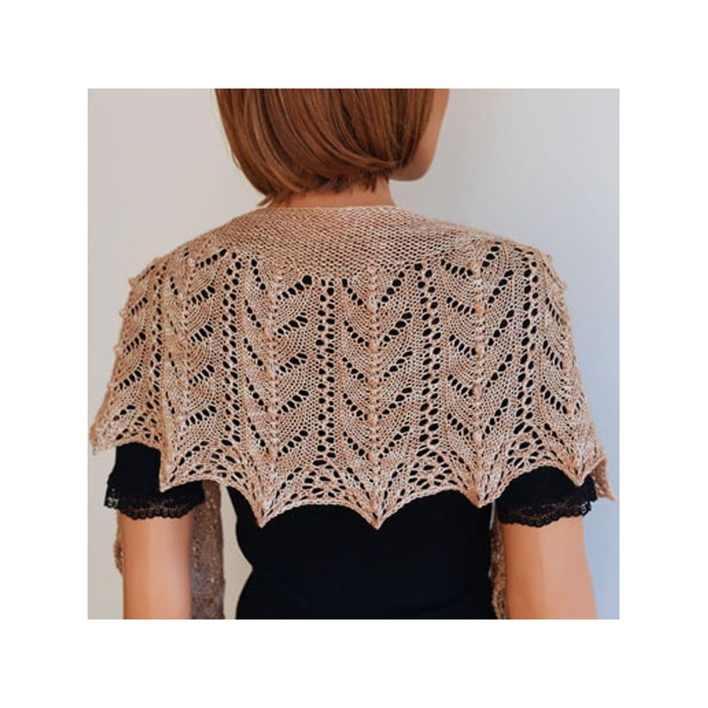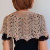Il est travaillé du haut vers le bas. Il commence avec des rangs raccourcis et se poursuit avec une large bordure en dentelle agrémentée de noppes.