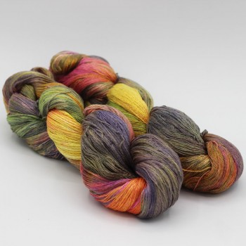 Silk Greggia est un fil dentelle fin (fine lace) 100 % soie qui accroche merveilleusement les couleurs. Cette soie présente un aspect légèrement sec, plutôt mat et régulier ; elle s'assouplit lorsqu'elle est travaillée.